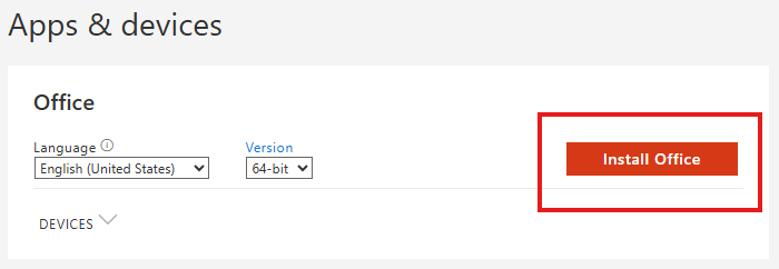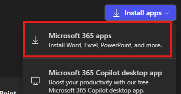 - On the top right, click Install Apps, then Microsoft 365 Apps, Install Office